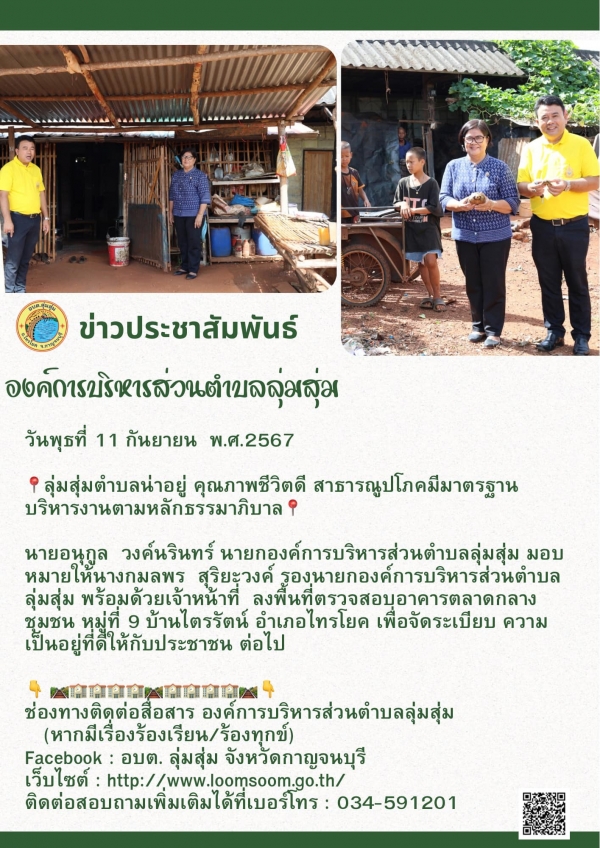 นายอนุกูล วงค์นรินทร์ นายกองค์การบริหารส่วนตำบลลุ่มสุ่ม มอบหมายให้นางกมลพร สุริยะวงค์ รองนายกองค์การบริหารส่วนตำบลลุ่มสุ่ม พร้อมด้วยเจ้าหน้าที่ ลงพื้นที่ตรวจสอบอาคารตลาดกลางชุมชน หมู่ที่ 9 บ้านไตรรัตน์ อำเภอไทรโยค เพื่อจัดระเบียบ ความเป็นอยู่ที่ดีให้กั