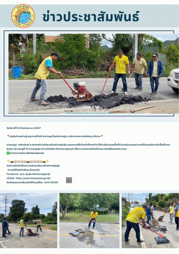 นายอนุกูล วงค์นรินทร์ นายกองค์การบริหารส่วนตำบลลุ่มสุ่ม มอบหมายให้เจ้าหน้าที่กองช่าง ได้ดำเนินการลงพื้นที่ทำการซ่อมแซมปะถนนที่ชำรุดเสียหายในพื้นที่ตำบลลุ่มสุ่ม บริเวณหมู่ที่ 10 ตำบลลุ่มสุ่ม อำเภอไทรโยค จังหวัดกาญจนบุรี เพื่อความปลอดภัยในชีวิตและทรัพย์สินของประชาชน ดำเนินการซ่อมเสร็จเรียบร้อยแล้ว