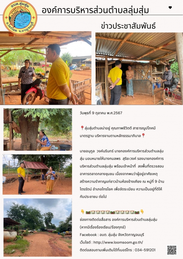 นายอนุกูล วงค์นรินทร์ นายกองค์การบริหารส่วนตำบลลุ่มสุ่ม มอบหมายให้นางกมลพร สุริยะวงค์ รองนายกองค์การบริหารส่วนตำบลลุ่มสุ่ม พร้อมเจ้าหน้าที่ ลงพื้นที่ตรวจสอบ อาคารตลาดกลางชุมชน เนื่องจากพบว่าผู้อยู่อาศัยเหตุสร้างความรำคาญแก่ชาวบ้านห้องข้างเคียง ณ หมู่ที่ 9 บ้านไตรรัตน์ อำเภอไทรโยค เพื่อจัดระเบียบ ความเป็นอยู่ที่ดีให้กับประชาชน ต่อไป