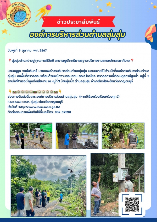 นายอนุกูล วงค์นรินทร์ นายกองค์การบริหารส่วนตำบลลุ่มสุ่ม มอบหมายให้เจ้าหน้าที่องค์การบริหารส่วนตำบลลุ่มสุ่ม ลงพื้นที่ตรวจสอบพร้อมด้วยพนักงานสอบสวน สภ.อ.ไทรโยค ตรวจสถานที่เกิดเหตุสถานีสูบน้ำ หมู่ที่ 3 สายไฟฟ้าแรงต่ำถูกตัดเสียหาย ณ หมู่ที่ 3 บ้านลุ่มผึ้ง ตำ