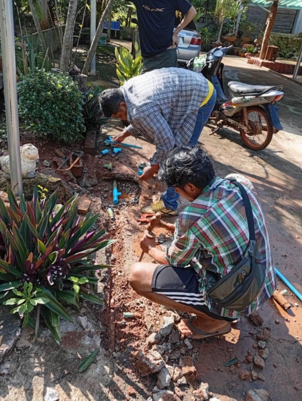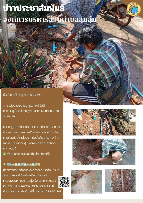 นายอนุกูล วงค์นรินทร์ นายกองค์การบริหารส่วนตำบลลุ่มสุ่ม มอบหมายให้พนักงานประปาดำเนินการซ่อมท่อน้ำ เนื่องจากท่อน้ำชำรุด หมู่ที่ 9 บ้านไตรรัตน์ ตำบลลุ่มสุ่ม อำเภอไทรโยค จังหวัดกาญจนบุรี