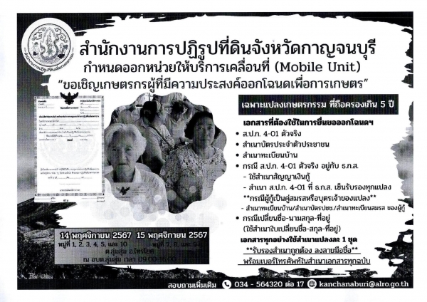 ที่ทำประโยชน์ในที่ดิน สปก และมีใบ สปก 4-01 ต้องการเปลี่ยนเป็นโฉนดเพื่อการเกษตร ให้มาติดต่อตามวัน เวลา ที่แจ้ง ด้วย อบต.ลุ่มสุ่ม ร่วมกับ สำนักงานการปฏิรูปที่ดินเพื่อเกษตรกร หรือ ส.ป.ก.