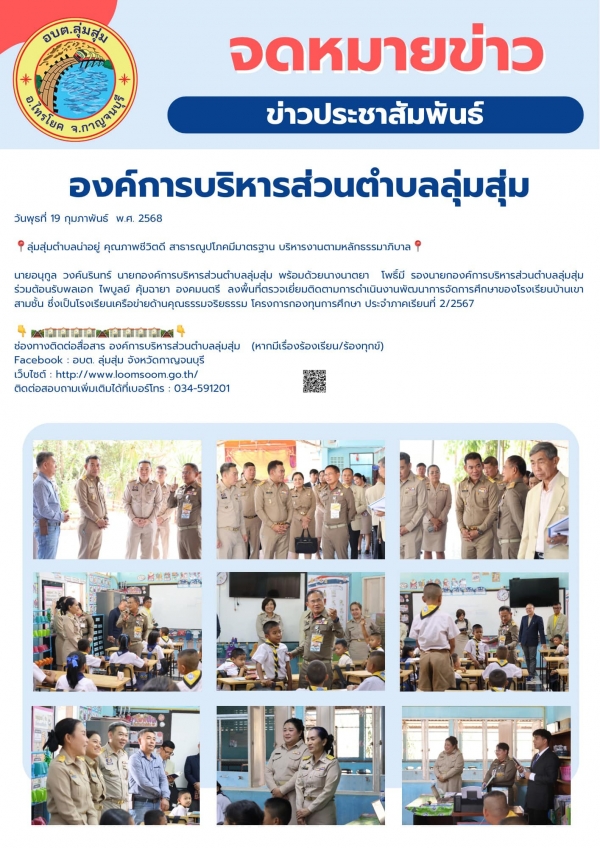 นายอนุกูล วงค์นรินทร์ นายกองค์การบริหารส่วนตำบลลุ่มสุ่ม พร้อมด้วยนางนาตยา โพธิ์มี รองนายกองค์การบริหารส่วนตำบลลุ่มสุ่ม ร่วมต้อนรับพลเอก ไพบูลย์ คุ้มฉายา องคมนตรี ลงพื้นที่ตรวจเยี่ยมติดตามการดำเนินงานพัฒนาการจัดการศึกษาของโรงเรียนบ้านเขาสามชั้น ซึ่งเป็นโรงเรียนเครือข่ายด้านคุณธรรมจริยธรรม โครงการกองทุนการศึกษา ประจำภาคเรียนที่ 2/2567 ณ โรงเรียนบ้านเขาสามชั้น ตำบลลุ่มสุ่ม อำเภอไทรโยค จังหวัดกาญจนบุรี