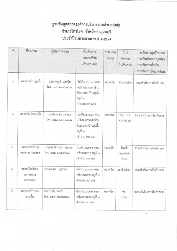 ฐานข้อมูลตลาดองค์การบริหารส่วนตำบลลุ่มสุ่ม อำเภอไทรโยค จังหวัดกาญจนบุรี ประจำปีงบประมาณ พ.ศ.2568