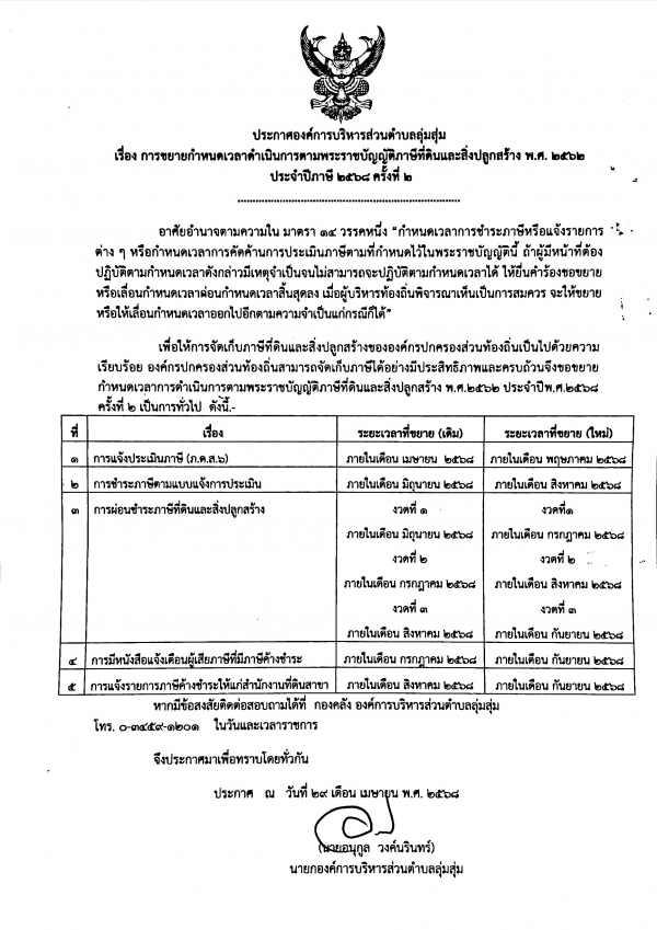 เรื่อง การขยายกำหนดเวลาดำเนินการตามพระราชบัญญัติภาษีที่ดินและสิ่งปลูกสร้าง พ.ศ.2562 ประจำปีภาษา 2568 ครั้งที่ 2