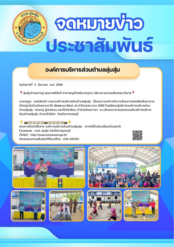 นายอนุกูล วงค์นรินทร์ นายกองค์การบริหารส่วนตำบลลุ่มสุ่ม เป็นประธานกล่าวเปิดงานโครงการส่งเสริมพัฒนาการเด็กปฐมวัยด้วยจักรยานขาไถ (Balance Bike) ประจำปีงบประมาณ 2568 โดยมีคณะผู้บริหารองค์การบริหารส่วนตำบลลุ่มสุ่ม คณะครู ผู้ปกครอง และเด็กนักเรียน เข้าร่วมโครงการฯ ณ บริเวณอาคารอเนกระสงค์องค์การบริหารส่วนตำบลลุ่มสุ่ม อำเภอไทรโยค จังหวัดกาณจนบุรี
