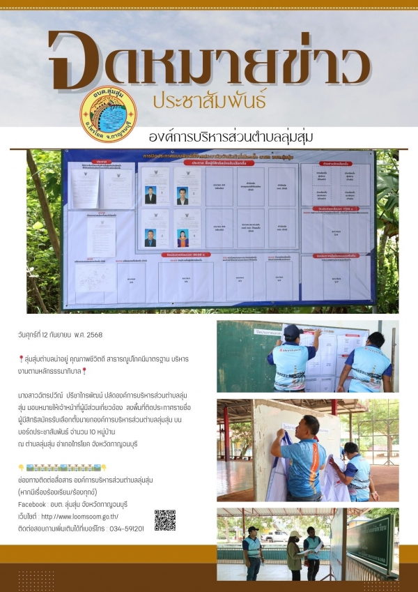 นางสาวฉัตรปวีณ์ ปรีชาไกรพัฒน์ ปลัดองค์การบริหารส่วนตำบลลุ่มสุ่ม มอบหมายให้เจ้าหน้าที่ผู้มีส่วนเกี่ยวข้อง ลงพื้นที่ติดประกาศรายชื่อผู้มีสิทธิสมัครรับเลือกตั้งนายกองค์การบริหารส่วนตำบลลุ่มสุ่ม บนบอร์ดประชาสัมพันธ์ จำนวน 10 หมู่บ้าน ณ ตำบลลุ่มสุ่ม อำเภอไทรโยค จังหวัดกาญจนบุรี