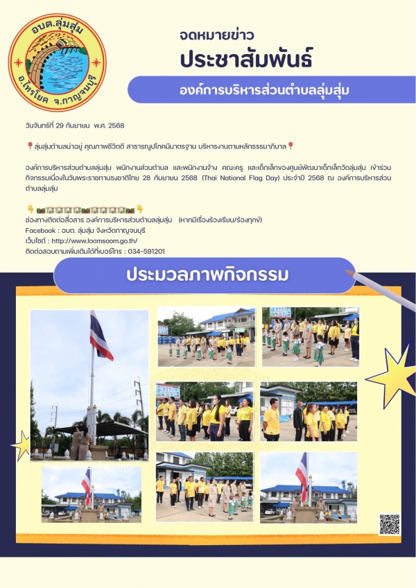 องค์การบริหารส่วนตำบลลุ่มสุ่ม พนักงานส่วนตำบล พนักงานจ้าง คณะครู และเด็กเล็กของศูนย์พัฒนาเด็กเล็กวัดลุ่มสุ่ม เข้าร่วมกิจกรรมเนื่องในวันพระราชทานธงชาติไทย 28 กันยายน (Thai National Flag Day) ประจำปี 2568 เพื่อเป็นการสร้างความภาคภูมิใจของคนในชาติ และเป็นการน้อมรำลึกในพระมหากรุณาธิคุณพระบาทสมเด็จพระมระมงกุฎเกล้าเจ้าอยู่หัว ที่ทรงพระราชทานธงไตรรงค์เป็นธงชาติไทย ณ องค์การบริหารส่วนตำบลลุ่มสุ่ม