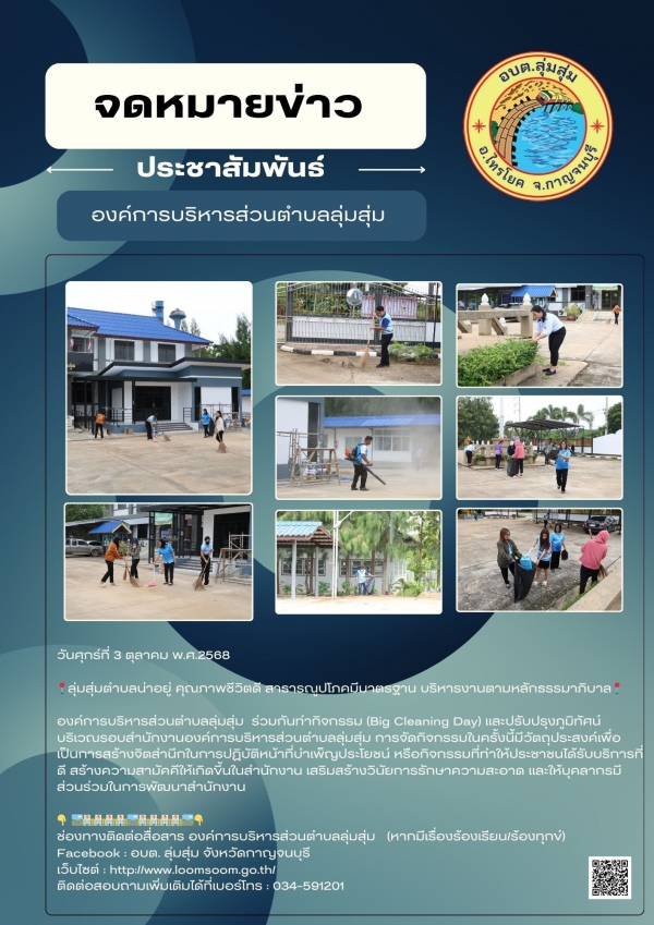 องค์การบริหารส่วนตำบลลุ่มสุ่ม ร่วมกันทำกิจกรรม (Big Cleaning Day) และปรับปรุงภูมิทัศน์ บริเวณรอบสำนักงานองค์การบริหารส่วนตำบลลุ่มสุ่ม การจัดกิจกรรมในครั้งนี้มีวัตถุประสงค์เพื่อเป็นการสร้างจิตสำนึกในการปฏิบัติหน้าที่บำเพ็ญประโยชน์ หรือกิจกรรมที่ทำให้ประชาชนได้รับบริการที่ดี สร้างความสามัคคีให้เกิดขึ้นในสำนักงาน เสริมสร้างวินัยการรักษาความสะอาด และให้บุคลากรมีส่วนร่วมในการพัฒนาสำนักงาน
