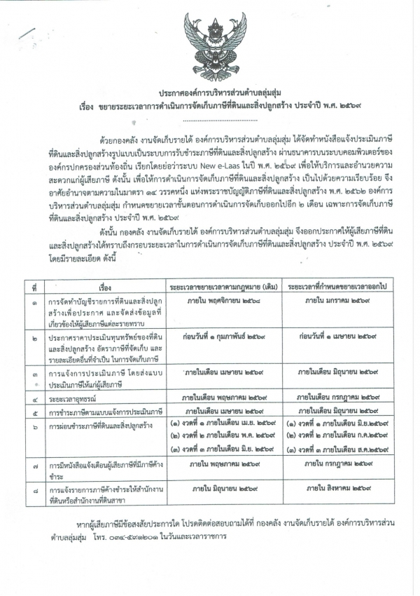 ประกาศองค์การบริหารส่วนตำบลลุ่มสุ่ม เรื่อง ขยายระยะเวลาการดำเนินการจัดเก็บภาษีที่ดินและสิ่งปลูกสร้าง ประจำปี พ.ศ.2569