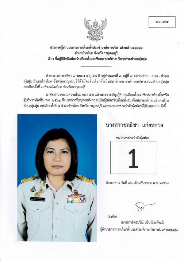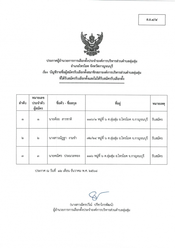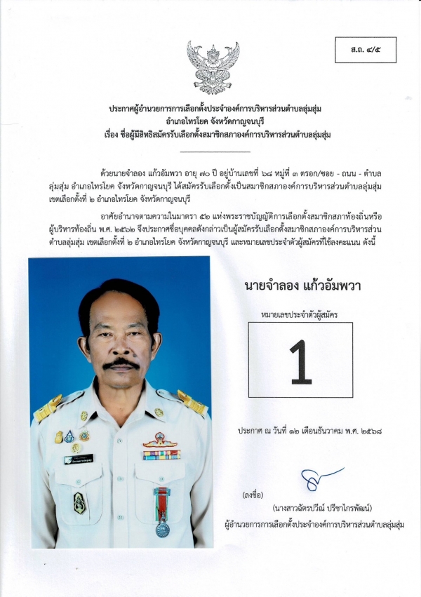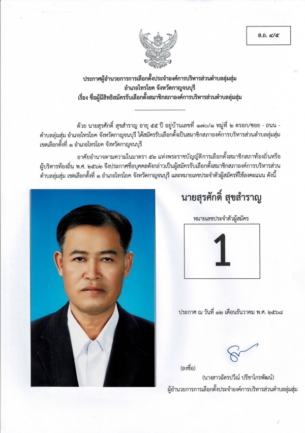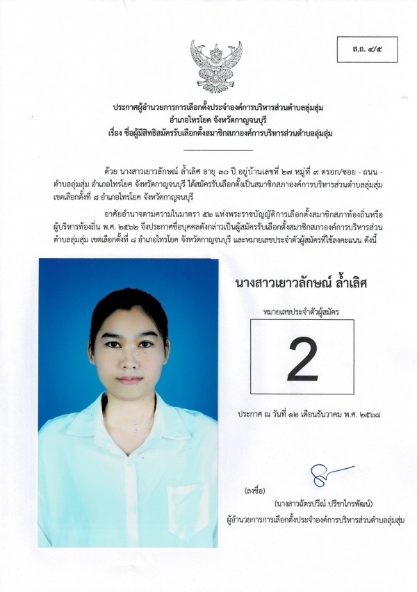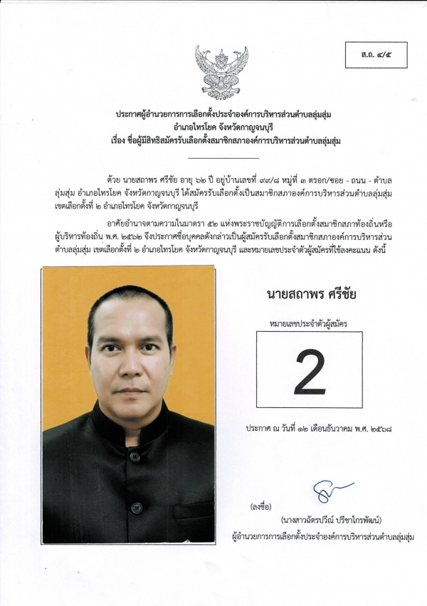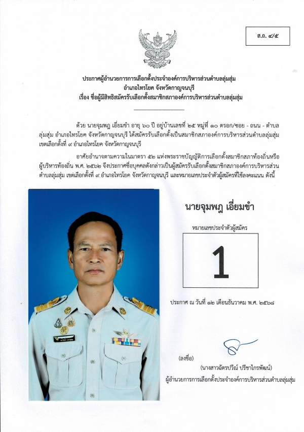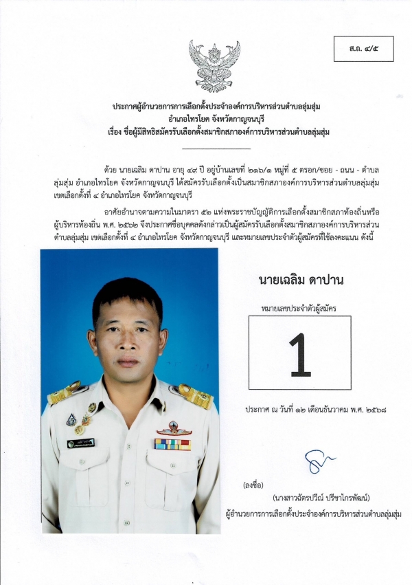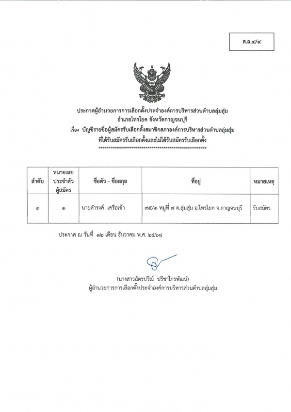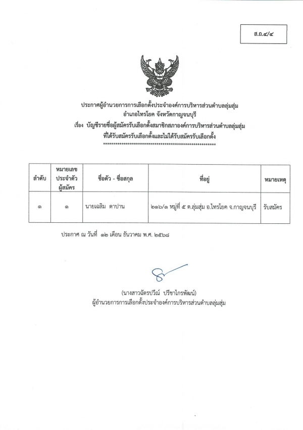 ประกาศผู้อำนวยการการเลือกตั้งประจำ องค์การบริหารส่วนตำบลลุ่มสุ่ม อำเภอไทรโยค จังหวัดกาญจนบุรี เรื่อง บัญชีรายชื่อผู้สมัครรับเลือกตั้งสมาชิกองค์การบริหารส่วนตำบลลุ่มสุ่ม ที่ได้รับสมัครเลือกตั้งและไม่ได้รับสมัครรับเลือกตั้ง