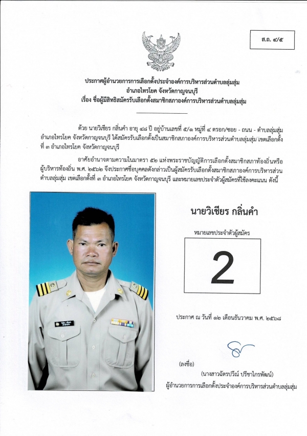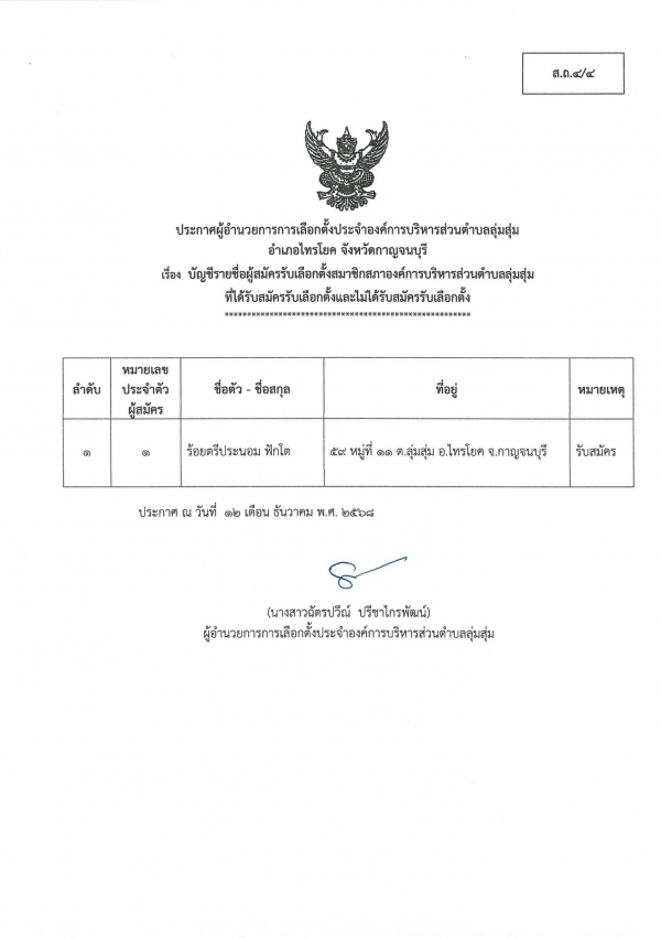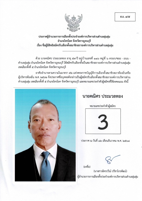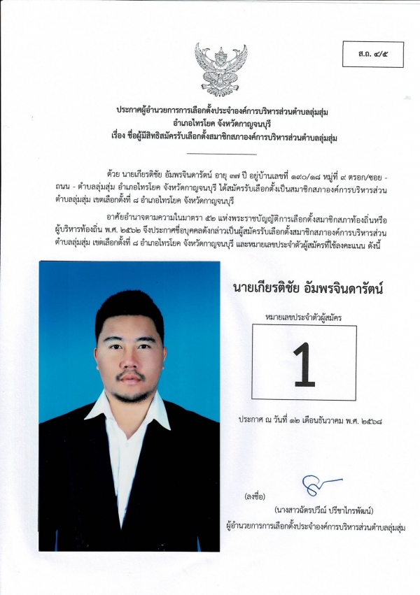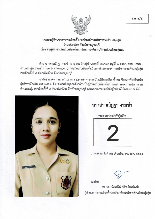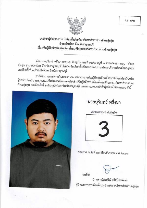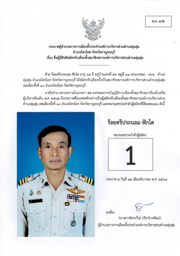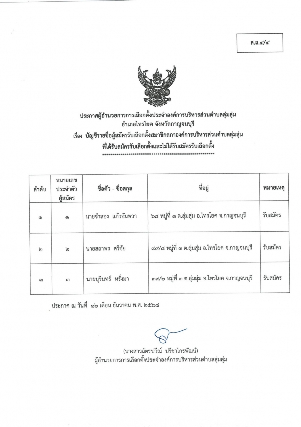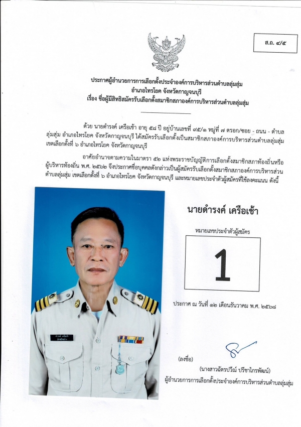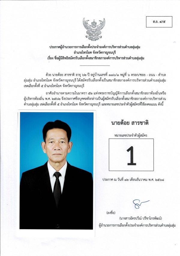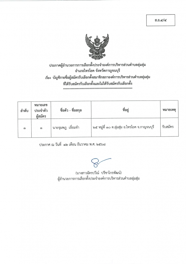 ประกาศผู้อำนวยการการเลือกตั้งประจำ องค์การบริหารส่วนตำบลลุ่มสุ่ม อำเภอไทรโยค จังหวัดกาญจนบุรี เรื่อง บัญชีรายชื่อผู้สมัครรับเลือกตั้งสมาชิกองค์การบริหารส่วนตำบลลุ่มสุ่ม ที่ได้รับสมัครเลือกตั้งและไม่ได้รับสมัครรับเลือกตั้ง