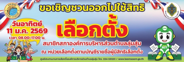 องค์การบริหารส่วนตำบลลุ่มสุ่ม ขอเชิญชวนผู้มีสิทธิเลือกตั้งทุกท่านในเขตตำบลลุ่มสุ่ม ร่วมใช้สิทธิเลือกตั้งสมาชิกสภาองค์การบริหารส่วนตำบลลุ่มสุ่ม วันอาทิตย์ที่ 11 มกราคม 2569 เวลา 08.00 – 17.00 น. ณ หน่วยเลือกตั้งที่ท่านมีรายช