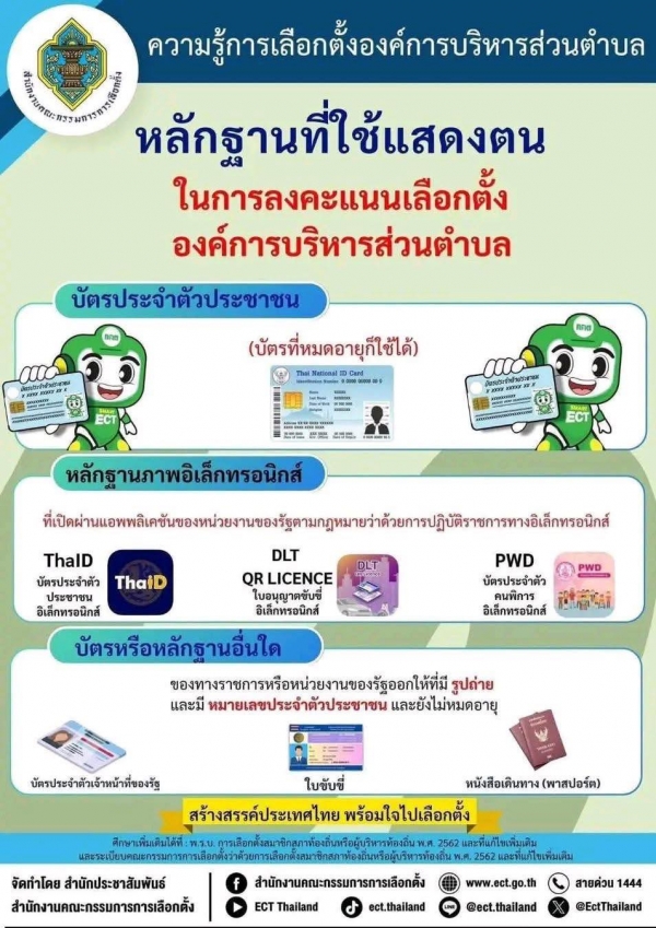 ประชาสัมพันธ์ ขอเชิญชวนประชาชนผู้มีสิทธิเลือกตั้งองค์การบริหารส่วนตำบล (อบต.) ทุกท่าน เตรียมหลักฐานให้พร้อม และออกไปใช้สิทธิเลือกตั้งอย่างพร้อมเพรียงเพื่อความสะดวก รวดเร็ว และถูกต้องตามระเบียบ ดังนี้ หลักฐานที่สามารถใช้แสดงตนได้ บัตรประจำตัวประชาชน