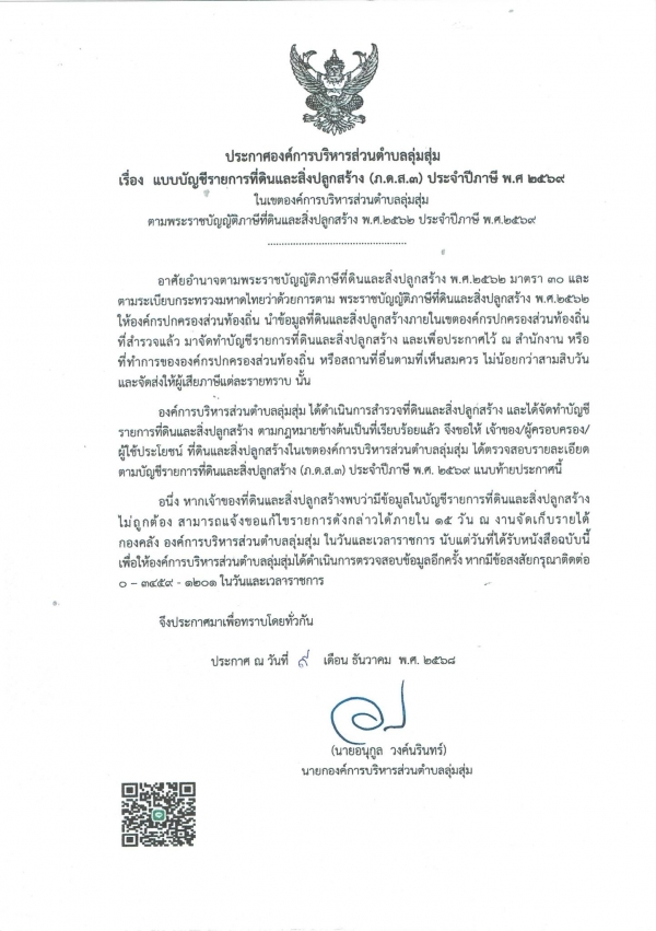 ประกาศองค์การบริหารส่วนตำบลลุ่มสุ่ม เรื่อง แบบบัญชีรายการที่ดินและสิ่งปลูกสร้าง (ภ.ด.ส.3) ประจำปีภาษี พ.ศ.2569 ในเขตองค์การบริหารส่วนตำบลลุ่มสุ่ม