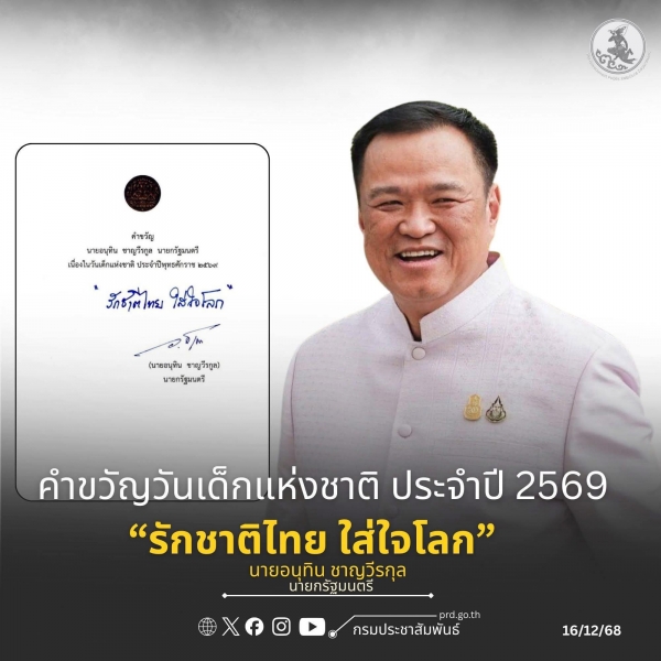 นายกรัฐมนตรีมอบคำขวัญวันเด็กแห่งชาติ ประจำปี 2569 “รักชาติไทย ใส่ใจโลก” วันที่ 16 ธันวาคม 2568 น.ส.ลลิดา เพริศวิวัฒนา รองโฆษกประจำสำนักนายกรัฐมนตรี เปิดเผยว่า นายอนุทิน ชาญวีระกุล นายกรัฐมนตรี ได้มอบคำขวัญวันเด็กแห่งชาติ ประจำปี 2569 เพื่อปลูกฝังให้เด็กแล