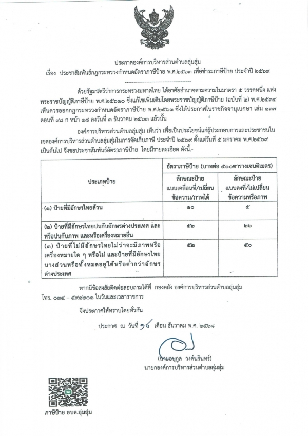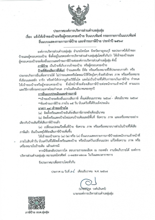 ประกาศองค์การบริหารส่วนตำบลลุ่มสุ่ม เรื่อง แจ้งให้เจ้าของป้ายหรือผู้ครอบครองป้าย รับแบบพิมพ์ กรอกรายการในแบบพิมพ์ยื่นแบบแสดงรายการภาษีป้าย และชำระภาษีป้าย ประจำปี 2569