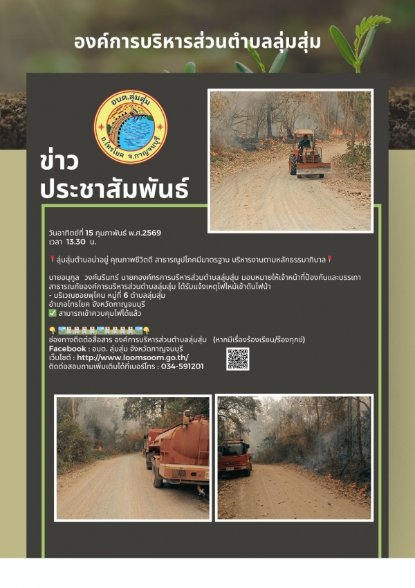 นายอนุกูล วงค์นรินทร์ นายกองค์กรการบริหารส่วนตำบลลุ่มสุ่ม มอบหมายให้เจ้าหน้าที่ป้องกันและบรรเทาสาธารณภัยองค์การบริหารส่วนตำบลลุ่มสุ่ม ได้รับแจ้งเหตุไฟไหม้เข้าดับไฟป่า - บริเวณซอยพุโคน หมู่ที่ 6 ตำบลลุ่มสุ่ม อำเภอไทรโยค จังหวัดกาญจนบุรี สามารถเข้าควบ