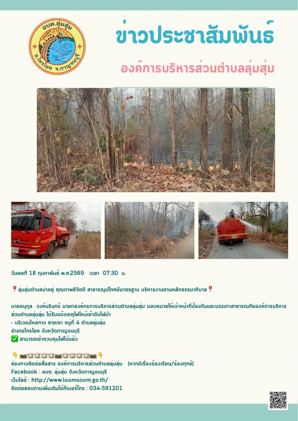 นายกองค์กรการบริหารส่วนตำบลลุ่มสุ่ม มอบหมายให้เจ้าหน้าที่ป้องกันและบรรเทาสาธารณภัยองค์การบริหารส่วนตำบลลุ่มสุ่ม ได้รับแจ้งเหตุไฟไหม้เข้าดับไฟป่า - บริเวณไหล่ทาง ชายเขา หมู่ที่ 4 ตำบลลุ่มสุ่ม อำเภอไทรโยค จังหวัดกาญจนบุรี สามารถเข้าควบคุมไฟได้แล้ว ช่องทางต