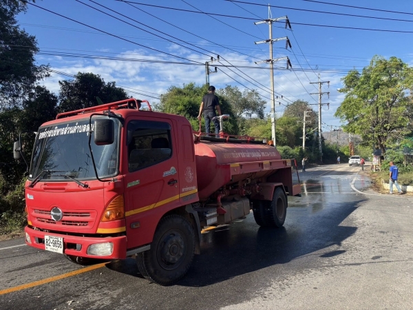 นายอนุกูล วงค์นรินทร์ นายกองค์การบริหารส่วนตำบลลุ่มสุ่ม มอบหมายให้เจ้าหน้าที่งานป้องกันและบรรเทาสาธารณภัย เข้าทำความสะอาดโดยการล้างถนน เนื่องจากรถบรรทุกมันสำปะหลังพลิกคว่ำบริเวณ สามแยกถ้ำเชลย หมู่ 10 ตำบลลุ่มสุ่ม อำเภอไทรโยค จังหวัดกาญจนบุรี