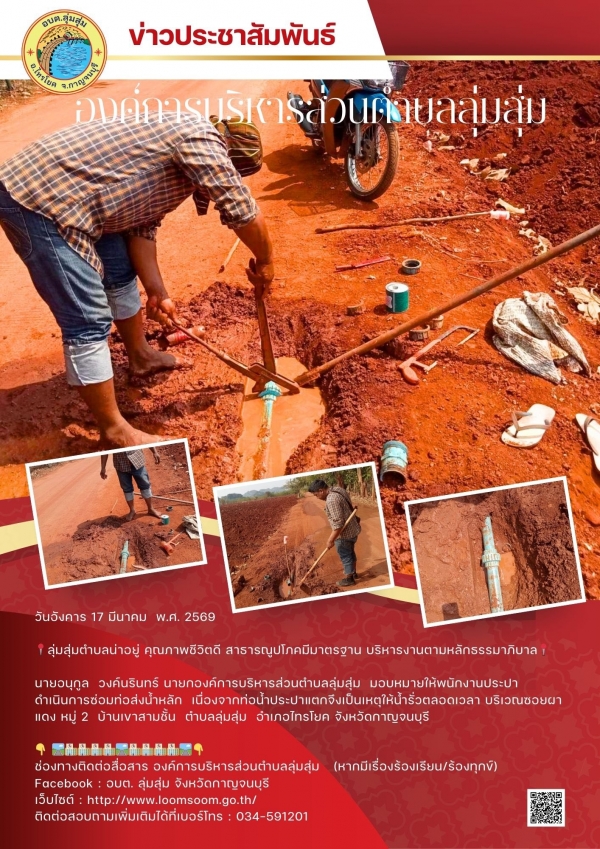 นายอนุกูล วงค์นรินทร์ นายกองค์การบริหารส่วนตำบลลุ่มสุ่ม มอบหมายให้พนักงานประปา ดำเนินการซ่อมท่อส่งน้ำหลัก เนื่องจากท่อน้ำประปาแตกจึงเป็นเหตุให้น้ำรั่วตลอดเวลา บริเวณซอยผาแดง หมู่ 2 บ้านเขาสามชั้น ตำบลลุ่มสุ่ม อำเภอไทรโยค จังหวัดกาญจนบุรี