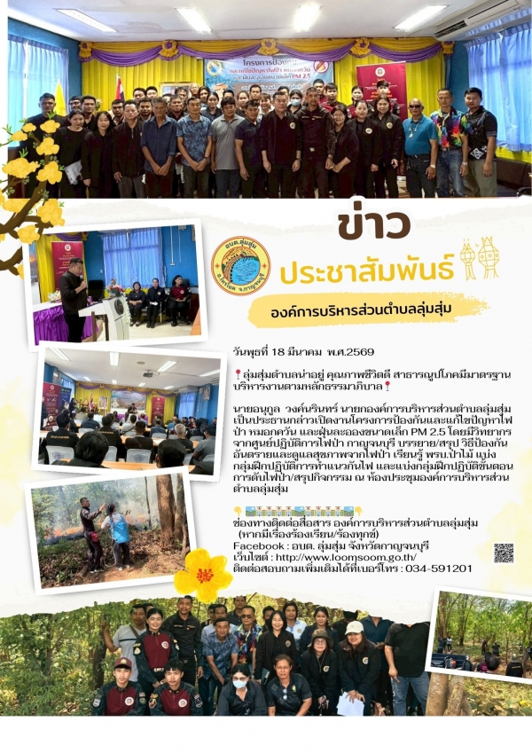 นายอนุกูล วงค์นรินทร์ นายกองค์การบริหารส่วนตำบลลุ่มสุ่ม เป็นประธานกล่าวเปิดงานโครงการป้องกันและแก้ไขปัญหาไฟป่า หมอกควันและฝุ่นละอองขนาดเล็ก PM 2.5 โดยมีวิทยากร จากศูนย์ปฏิบัติการไฟป่า กาญจนบุรี บรรยาย/สรุป วิธีป้องกันอันตรายและดูแลสุขภาพจากไฟป่า เรียนรู้