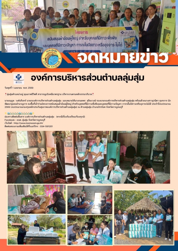 นายอนุกูล วงค์นรินทร์ นายกองค์การบริหารส่วนตำบลลุ่มสุ่ม มอบหมายให้นางกมลพร สุริยะวงษ์ รองนายกองค์การยริหารส่วนตำบลลุ่มสุ่ม พร้อมด้วยนางสาวฐานิตา จุนทการ นักพัฒนาชุมชนชำนาญการ ลงพื้นที่เข้าร่วมโครงการสนับสนุนผ้าอ้อมผู้ใหญ่ สำหรับบุคคลที่มีภาวะพึ่งพิงและบุคคลที่มีภาวะปัญหา การกลั้นปัสสาวะหรืออุจจาระไม่ได้ ประจำปีงบประมาณ 2569 (งบประมาณกองทุนหลักประกันสุขภาพองค์การบริหารส่วนตำบลลุ่มสุ่ม) ณ ตำบลลุ่มสุ่ม อำเภอไทรโยค จังหวัดกาญจนบุรี