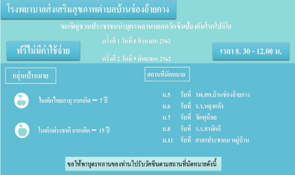 ประชาสัมพันธ์ ขอเชิญชวนนำบุตรหลานหยอดวัคซีนป้องกันโรคโปลิโอ