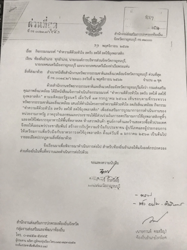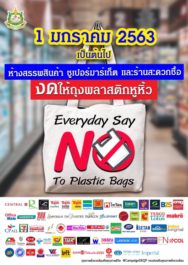 กิจกรรม "ทำความดีด้วยหัวใจ ลดรับ ลดให้ ลดใช้ถุงพลาสติก"เพื่อส่งเสริมการบูรณาการการดำเนินงานของหน่วยงานภาครัฐ ภาคธุรกิจเอกชนและประชาชนให้มีส่วนร่วมในการลดปริมาณการใช้ถุงพลาสติกหูหิ้วและงดใช้บรรจุอาหารให้พื้นที่ตลาดสด ห้างสรรพสินค้า ศุนย์การค้าและร้านสะดวกซื้อทั่วประเทศ