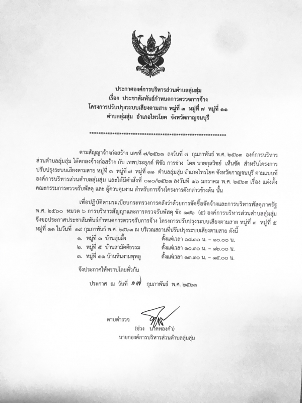 ประชาสัมพันธ์ เรื่อง กำหนดการตรวจการจ้าง โครงการปรับปรุงระบบเสียงตามสาย หมู่ที่ 3 หมู่ที่ 7 หมู่ที่ 11 ตำบลลุ่มสุ่ม อำเภอไทรโยค จังหวัดกาญจนบุรี