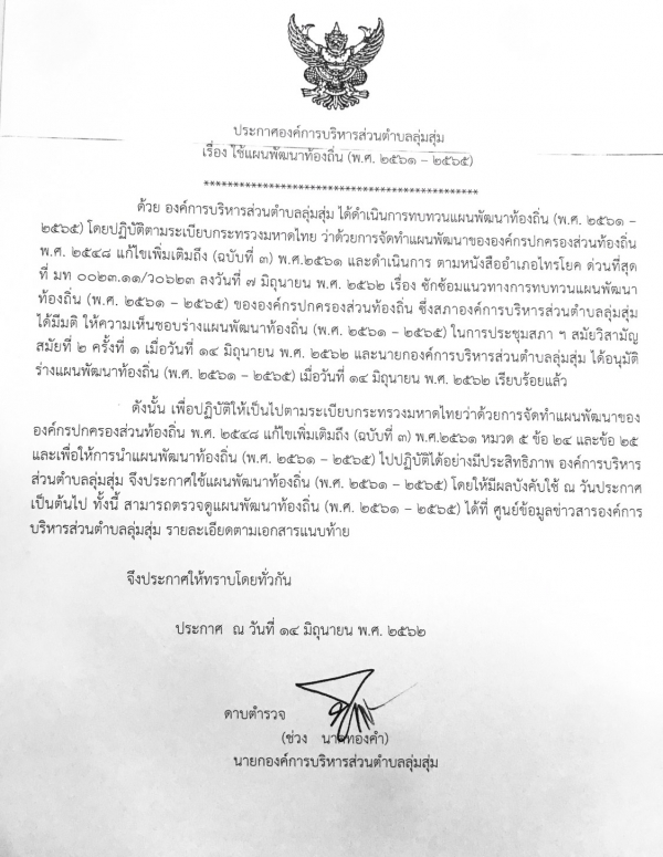 ส่วนตำบลลุ่มสุ่ม จึงประกาศใช้แผนพัฒนาท้องถิ่น (พ.ศ. ๒๕๖๑ - ๒๕๖๕) โดยให้มีผลบังคับใช้ ณ วันประกาศ
