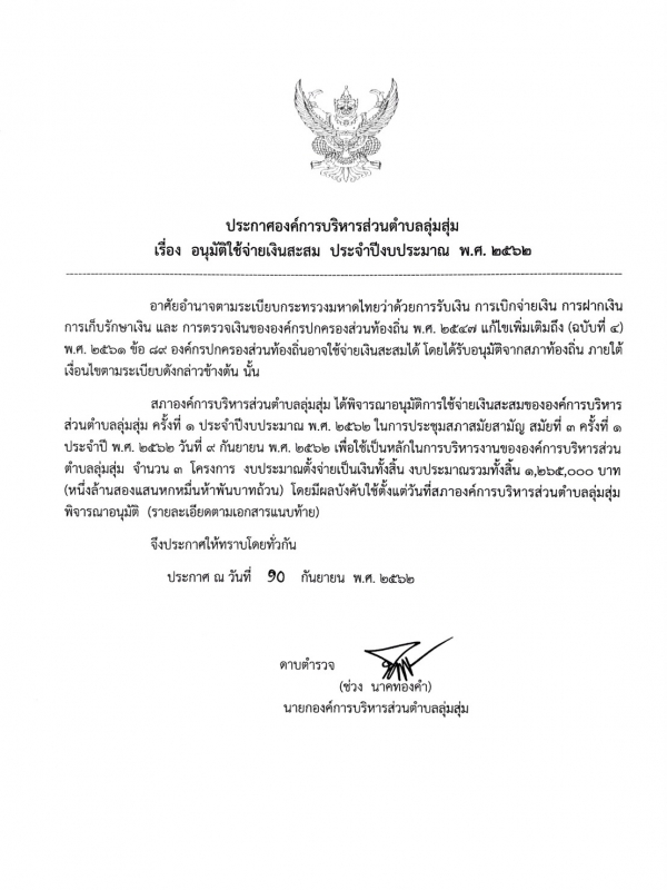 ประกาศองค์การบริหารส่วนตำบลลุ่มสุ่ม เรื่อง อนุมัติใช้จ่ายเงินสะสม ประจำปีงบประมาณ พ.ศ.2562