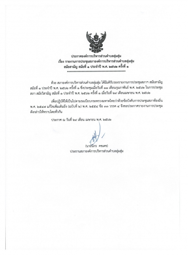 ประกาศรายงานการประชุมสภาองค์การบริหารส่วนตำบลลุ่มสุ่ม สมัยสามัญ สมัยที่ 1 ประจำปี พ.ศ. 2562 ครั้งที่ 1