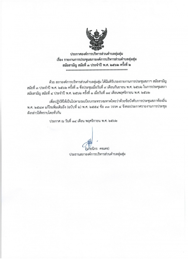 ประกาศรายงานการประชุมสภาองค์การบริหารส่วนตำบลลุ่มสุ่ม สมัยสามัญ สมัยที่ 3 ปี 2562