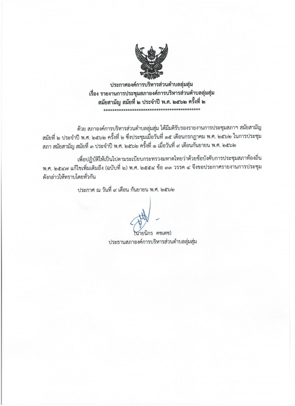รายงานการประชุมสภาองค์การบริหารส่วนตำบลลุ่มสุ่ม สมัยสามัญ สมัยที่ 2 ปี 2562