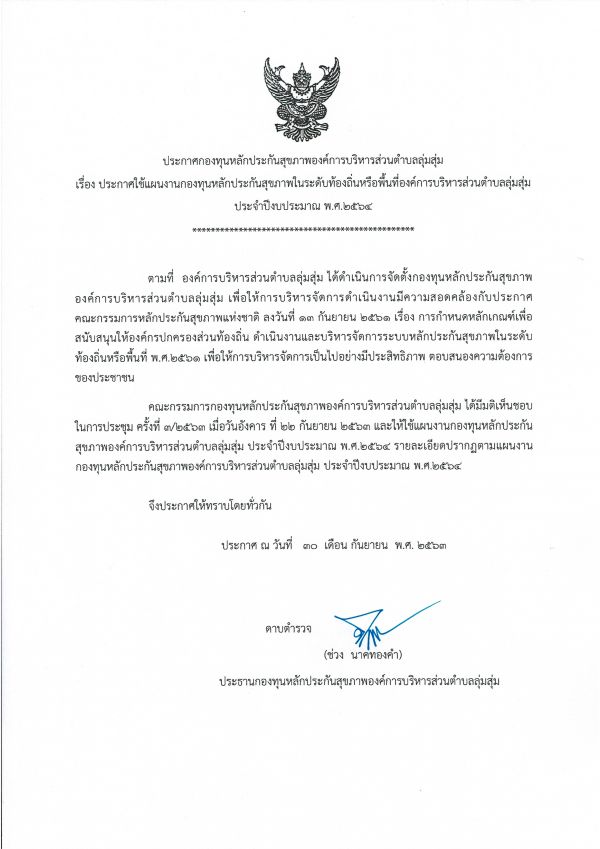 ประกาศกองทุนหลักประกันสุขภาพองค์การบริหารส่วนตำบลลุ่มสุ่ม เรื่อง ประกาศใช้แผนงานกองทุนหลักประกันสุขภาพในระดับท้องถิ่นหรือพื้นที่องค์การบริหารส่วนตำบลลุ่มสุ่ม ประจำปีงบประมาณ พ.ศ.2564