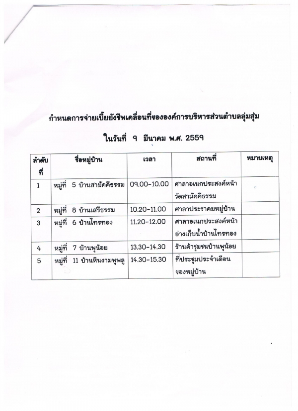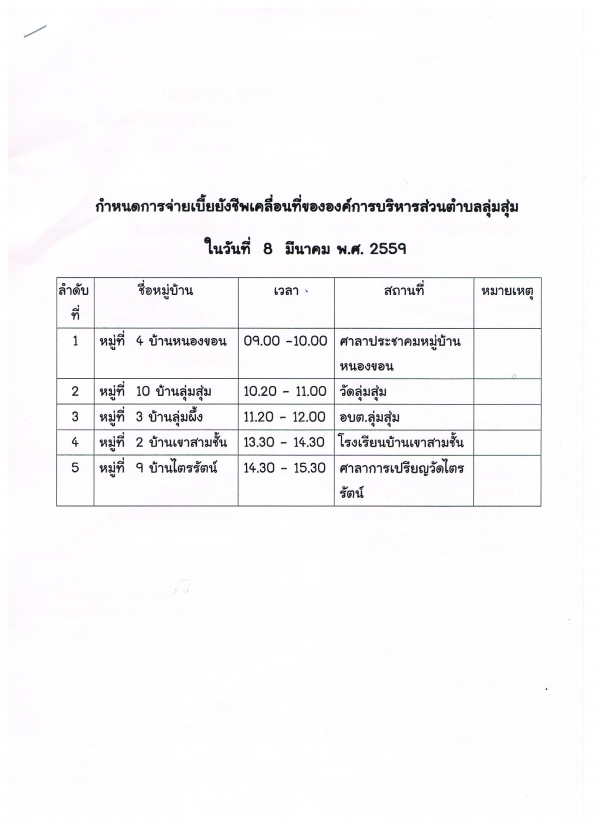 กำหนดการจ่ายเบี้ยยังชีพเคลื่อนที่ขององค์การบริหารส่วนตำบลลุ่มสุ่ม ในวันที่ 8 - 9 มีนาคม พ.ศ. 2559
