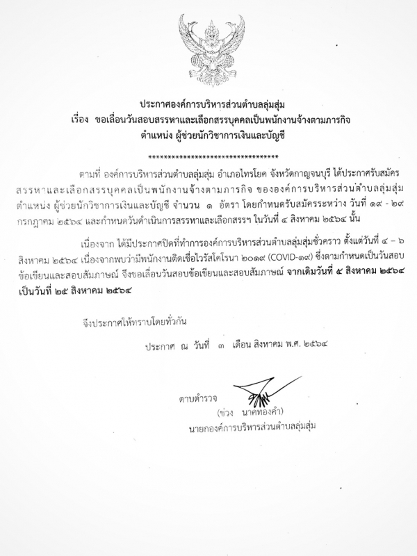 ประกาศองค์การบริหารส่วนตำบลลุ่มสุ่ม เรื่อง ขอเลื่อนวันสอบสรรหาและเลือกสรรบุคคลเป็นพนักงานจ้างตามภารกิจ ต่ำแหน่ง ผู้ช่วยนักวิชาการเงินและบัญชี