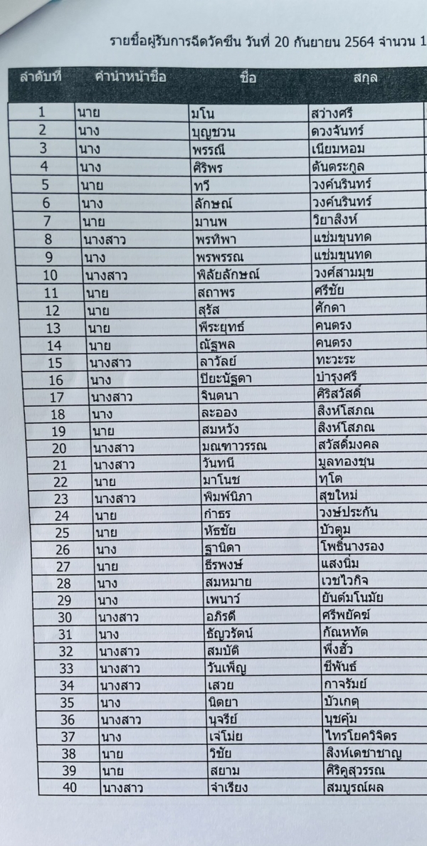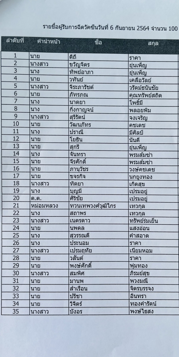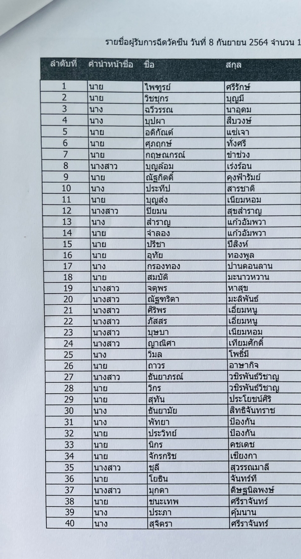 เรื่อง รายชื่อผู้ได้รับการฉีดวัคซีนป้องกันโรคติดเชื้อไวรัสโคโรนา (COVID-19)