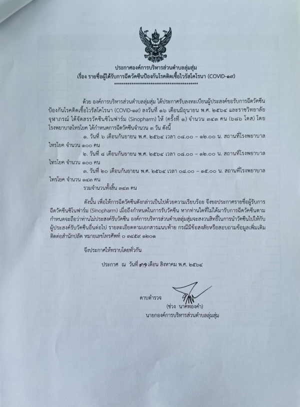 ประกาศองค์การบริหารส่วนตำบลลุ่มสุ่ม เรื่อง รายชื่อผู้ได้รับการฉีดวัคซีนป้องกันโรคติดเชื้อไวรัสโคโรนา (COVID-19)