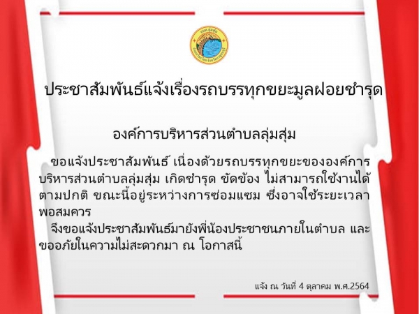ขอแจ้งประชาสัมพันธ์ เนื่องด้วยรถบรรทุกขยะขององค์การ