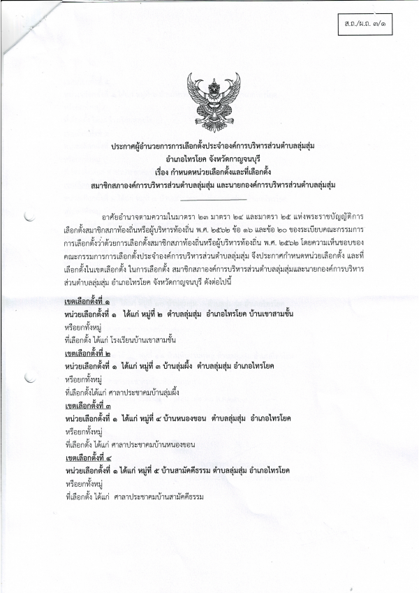 ประกาศผู้อำนวยการการเลือกตั้งประจำองค์การบริหารส่วนตำบลลุ่มสุ่ม เรื่อง กำหนดหน่วยเลือกตั้งและที่เลือกตั้งสมาชิกสภาองค์การบริหารส่วนตำบลลุ่มสุ่ม และนายกองค์การบริหารส่วนตำบลลุ่มสุ่ม