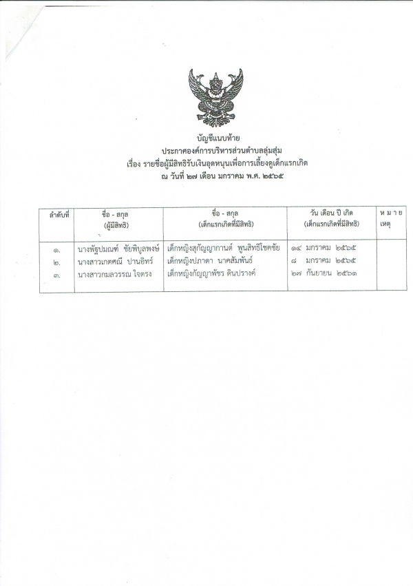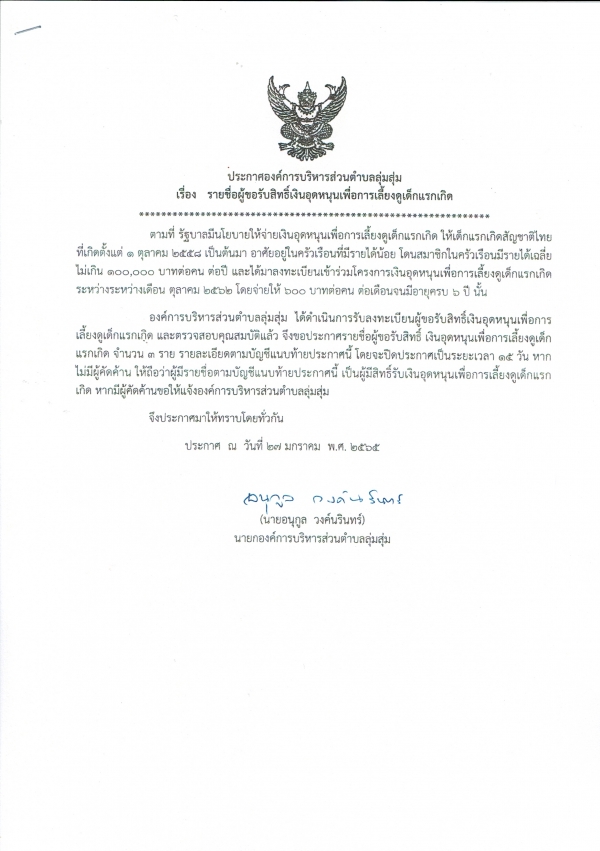 ประกาศองค์การบริหารส่วนตำบลลุ่มสุ่ม เรื่องรายชื่อผู้ขอรับสิทธิ์เงินอุดหนุนเพื่อการเลี้ยงดูเด็กแรกเกิด