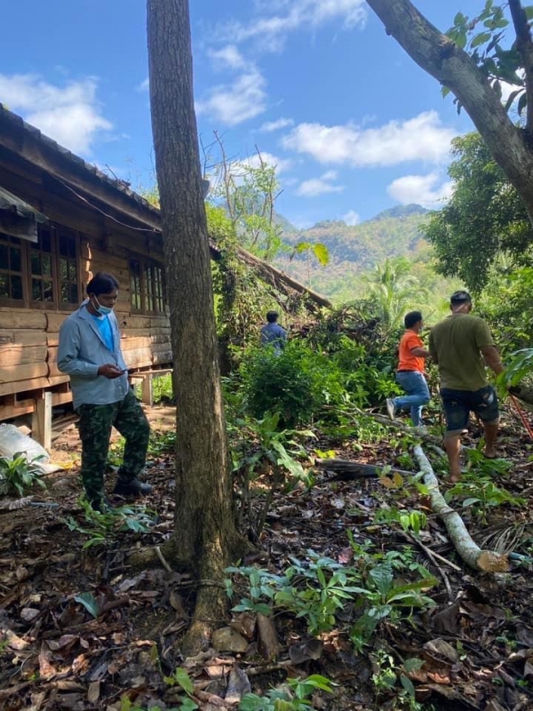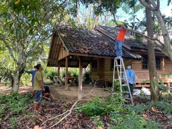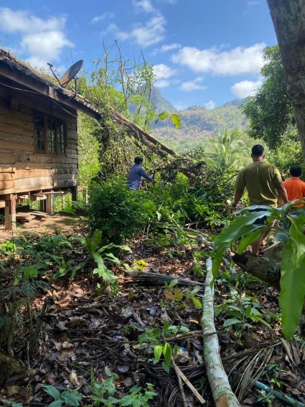 เจ้าพนักงานป้องกันและบรรเทาสาธารณภัยเร่งช่วยเหลือ เนื่องจากเมื่อคืนที่ผ่านมาฝนตกลมแรงพัดต้นไม้ล้มทับบ้านเรือน โดยการตัดกิ่งไม้ที่ทับบ้านออก เพื่อเป็นการบรรเทาความเดือดร้อนของชาวบ้าน