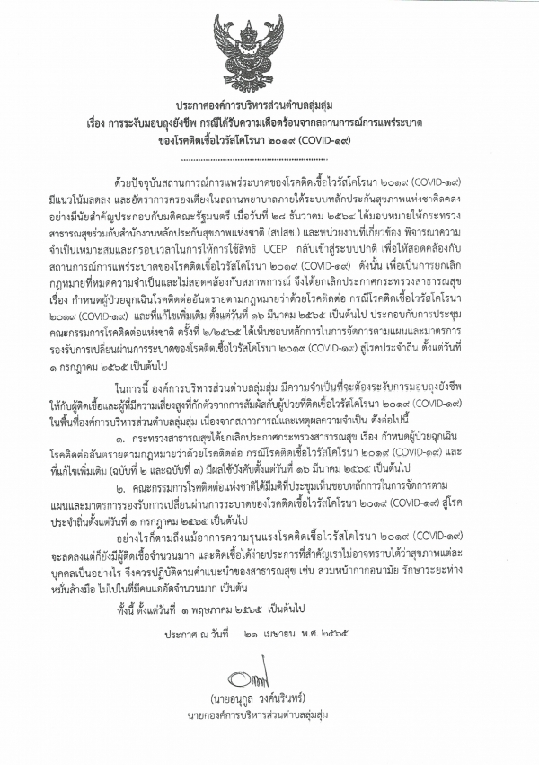 ประกาศองค์การบริหารส่วนตำบลลุ่มสุ่ม เรื่อง การระงับมอบถุงยังชีพ กรณีได้รับความเดือดร้อนจากสถานการณ์การแพร่ระบาดของโรคติดเชื้อไวรัสโคโรนา 2019 (COVID-19)