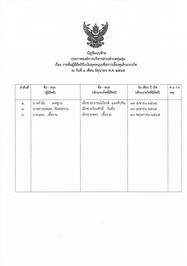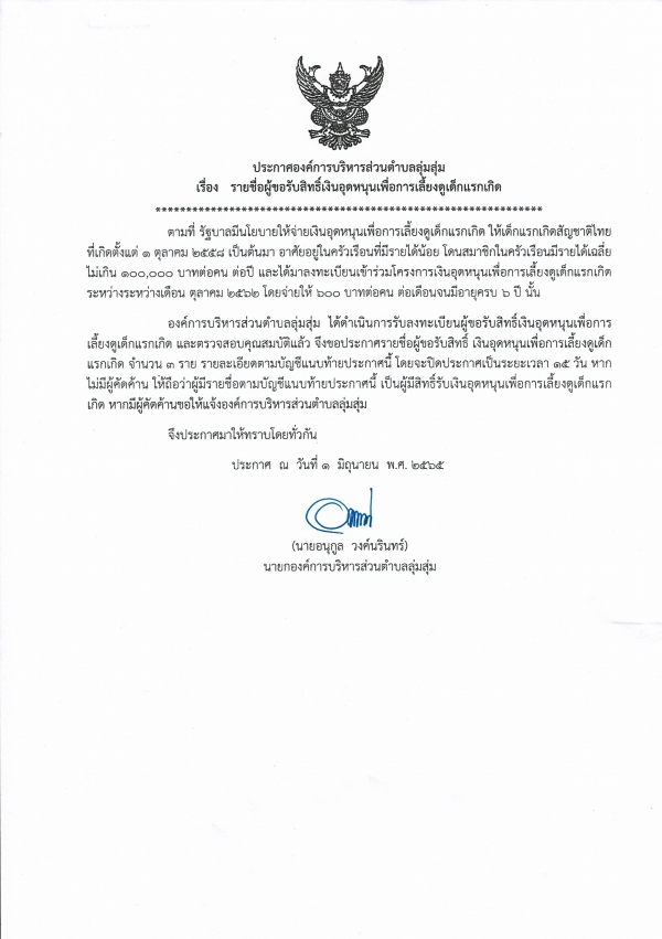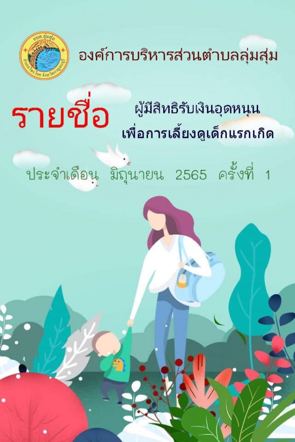 ประกาศองค์การบริหารส่วนตำบลลุ่มสุ่ม เรื่อง รายชื่อผู้ขอรับสิทธิ์เงินอุดหนุนเพื่อการเลี้ยงดูเด็กแรกเกิด ณ วันที่ 1 มิถุนายน พ.ศ.2565