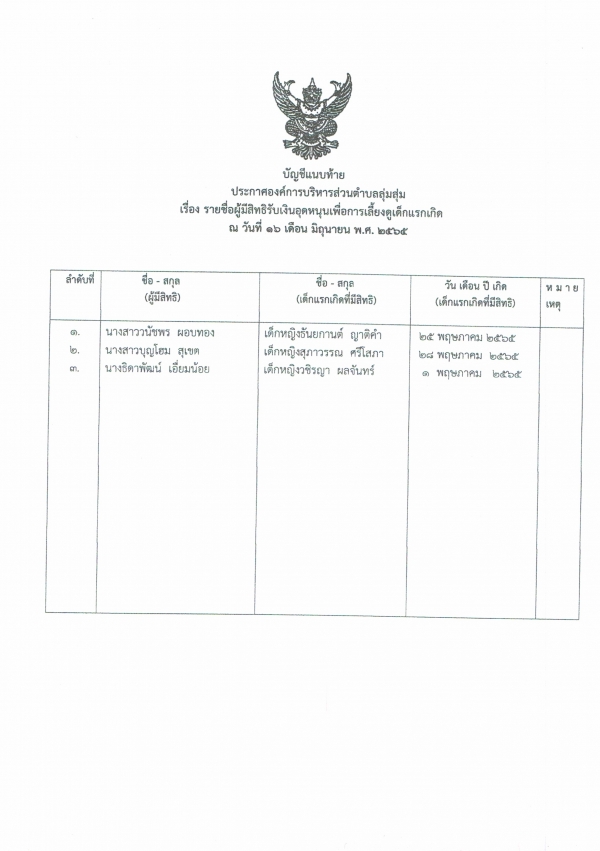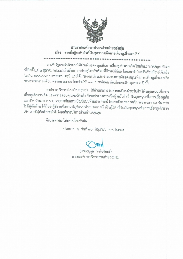 ประกาศองค์การบริหารส่วนตำบลลุ่มสุ่ม บัญชีรายชื่อผู้ขอรับสิทธิเงินอุดหนุน เพื่อการเลี้ยงดูเด็กแรกเกิด ปีงบประมาณ พ.ศ.2565 ประจำเดือนมิถุนายน 2565 ครั้งที่ 2
