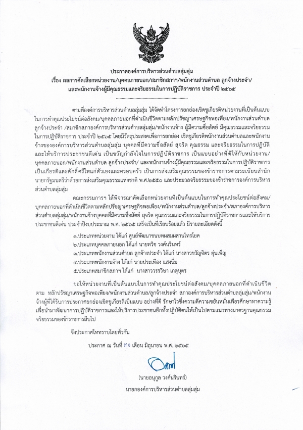 ประกาศองค์การบริหารส่วนตำบลลุ่มสุ่ม เรื่อง ผลการคัดเลือกหน่วยงาน บุคคลภายนอก สมาชิกสภาตำบล พนักงานส่วนตำบล ลูกจ้างประจำและพนักงานจ้างผู้มีคุณธรรมในการปฏิบัติราชการ ประจำปี 2565