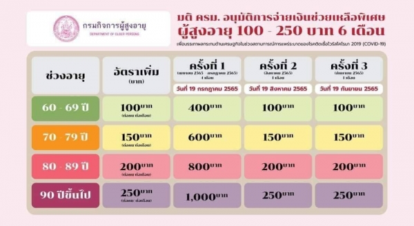 ครม.อนุมัติการจัดสรรงบประมาณจากงบกลาง ปี 65 เพื่อจ่ายเงินช่วยเหลือพิเศษผู้สูงอายุ 10.9 ล้านคน เป็นวงเงินประมาณ 8,300 ล้านบาท โดยผู้สูงอายุ 60 ปี ขึ้นไป จะได้รับเงินช่วยเหลือเป็นจำนวนเดือนละ 100-250 บาท/คน/เดือน เป็นระยะเวลา 6 เดือน