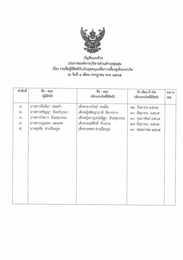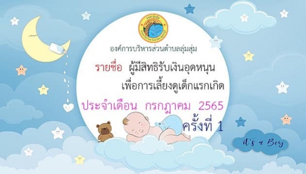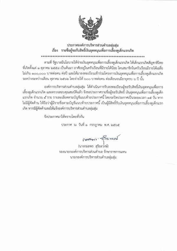 ประกาศองค์การบริหารส่วนตำบลลุ่มสุ่ม บัญชีรายชื่อผู้ขอรับสิทธิเงินอุดหนุน เพื่อการเลี้ยงดูเด็กแรกเกิด ปีงบประมาณ พ.ศ.2565 ประจำเดือนกรกฎาคม 2565 ครั้งที่ 1